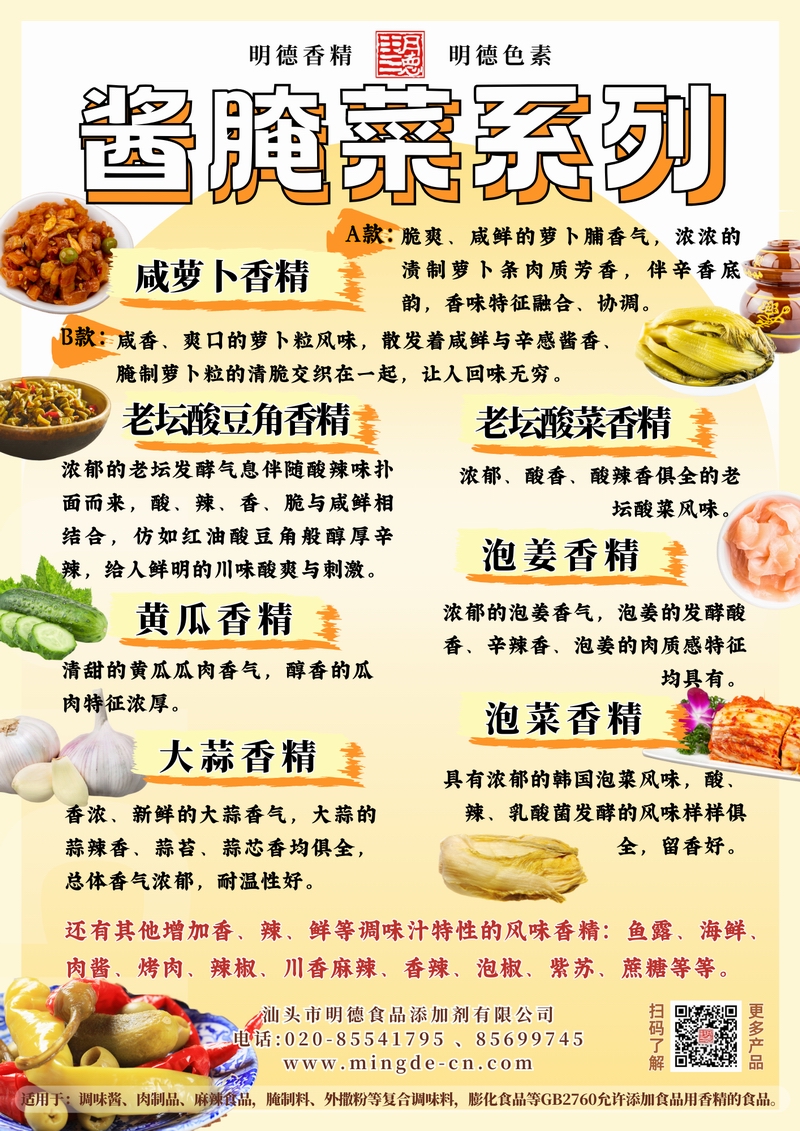 汕頭市明德食品添加劑有限公司的醬腌菜系列香精,涵蓋咸蘿卜、老壇酸豆角、老壇酸菜、黃瓜、泡姜、泡菜、大蒜等多種品類。香氣真實(shí)、留香穩(wěn)定,適用于鹵味熟食、腌制菜肴、復(fù)合調(diào)味料、調(diào)味醬、速食及方便食品等B端應(yīng)用,幫助工廠打造具有地道風(fēng)味特征的產(chǎn)品。